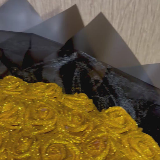 Add a touch of sparkle to any special occasion with our Gold Glitter Rose Bouquet. Made with your choice of 30, 40, or 50 glitter roses, this stunning bouquet also features all black wrapping, finished with a gold bow. It’s the perfect gift choice.