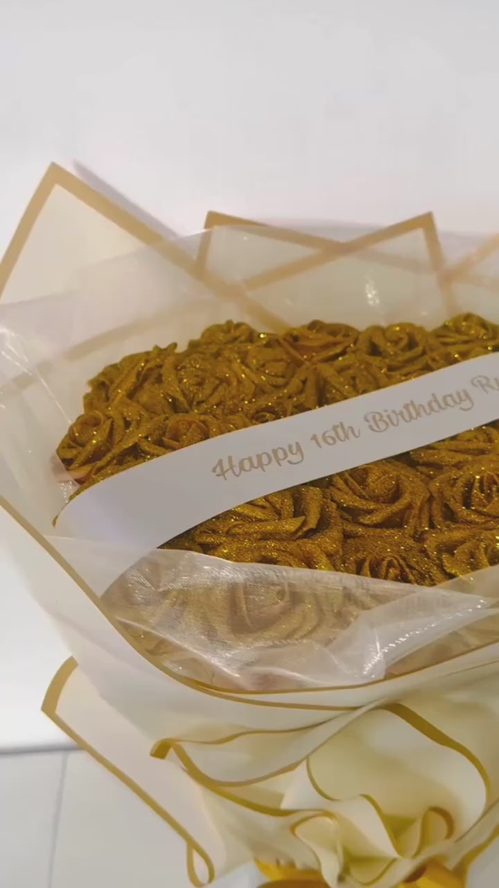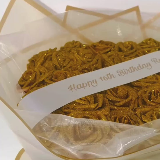 Add a touch of sparkle to any special occasion with our Gold Glitter Rose Bouquet. Made with your choice of 30, 40, or 50 glitter roses, this stunning bouquet also features cream & gold wrapping, finished with a gold bow. It’s the perfect gift choice.