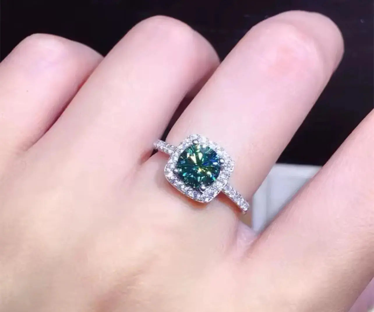 This engagement ring is a stunning piece of jewelry that features a round Moissanite center stone. The green Moissanite is known for its durability and brilliance, making it a great alternative to natural diamonds at a fraction of the cost.