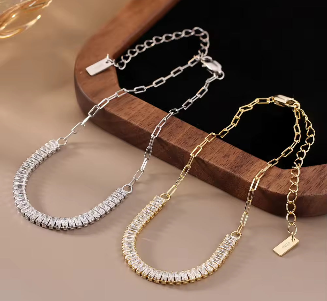 Featuring a paperclip-style chain, this piece is adorned with lustrous tennis chain design that add a touch of sophistication to any outfit.
