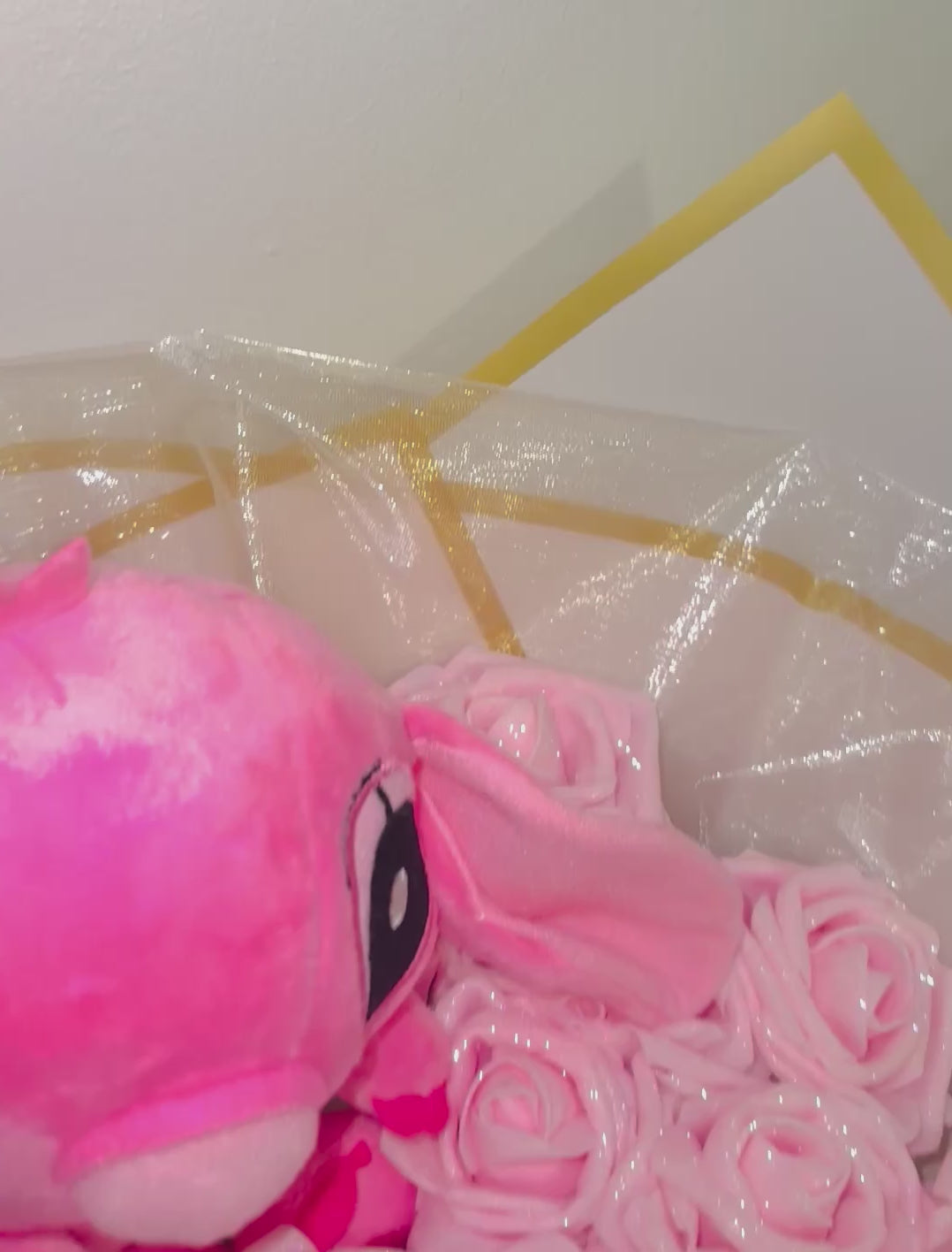 A beautiful pink glitter rose bouquet crafted with 30 artificial eternal roses, complete with the adorable Angel teddy from Lilo & Stitch. Finished with a personalised message of your choice.