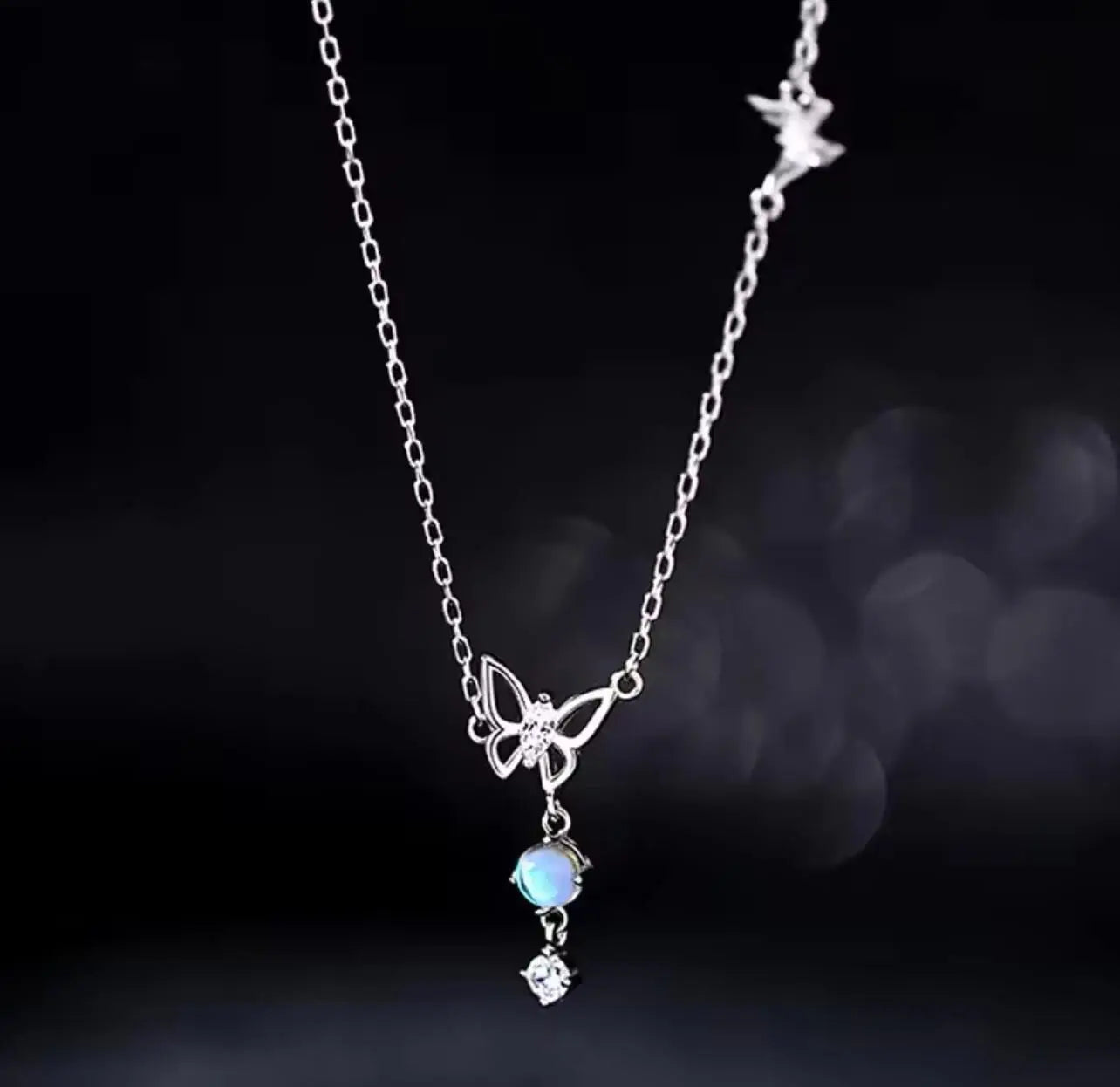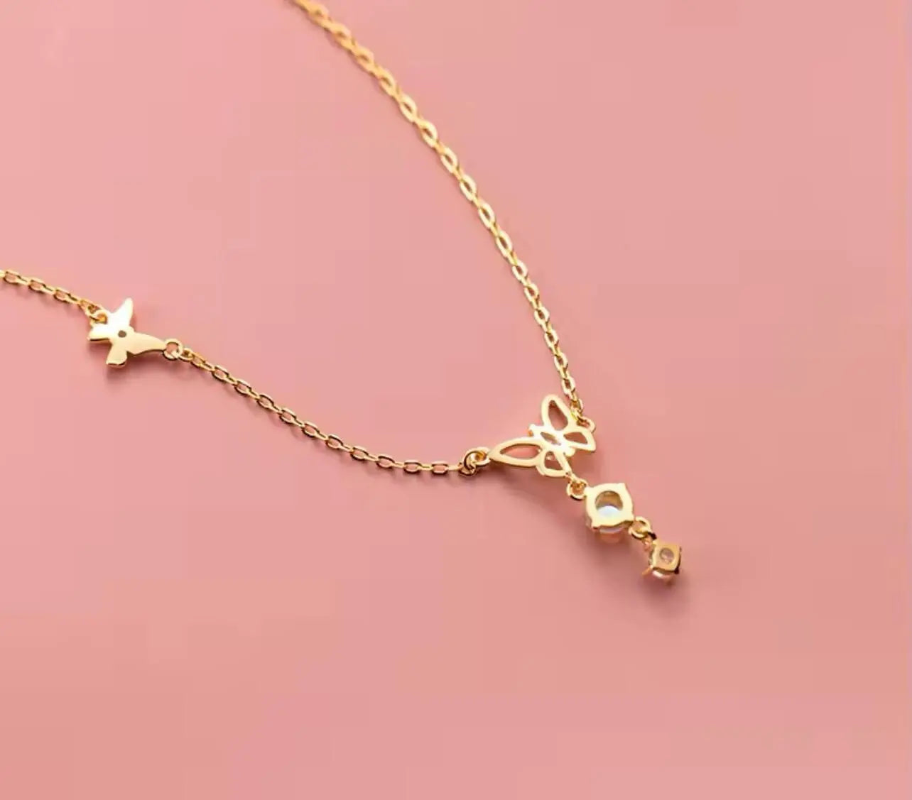 This exquisite butterfly necklace features a clavicle chain and is offered in both sterling silver and 18k gold plating, ensuring it remains 100% tarnish-free. The chain is adjustable, measuring 41.5 cm with an additional 3 cm for versatility. The main pendant has a size of 2.2 cm, making it a delicate yet striking accessory.